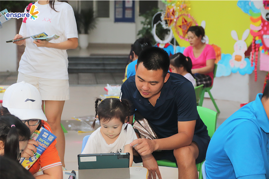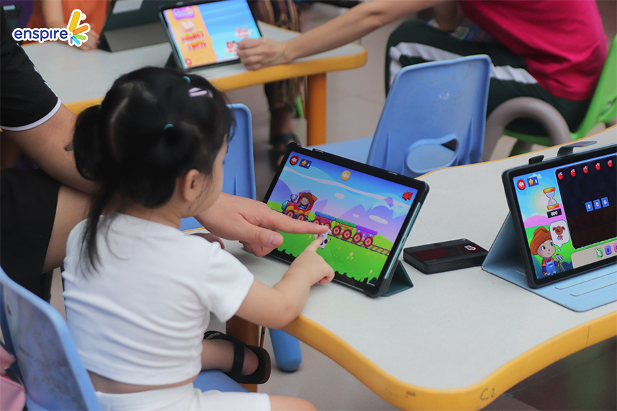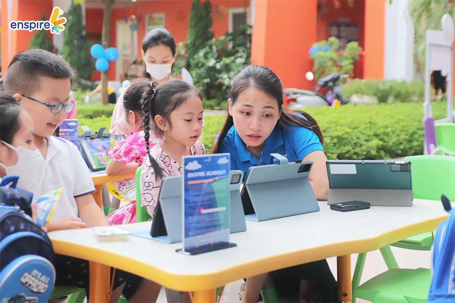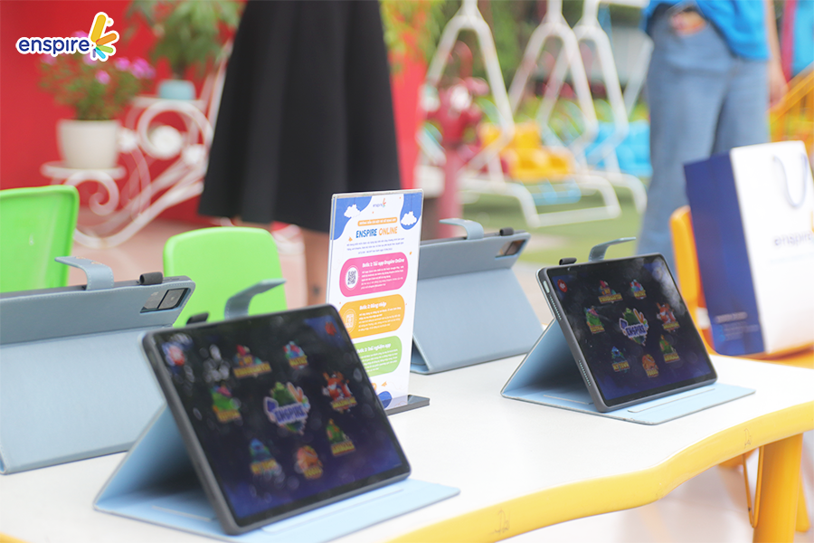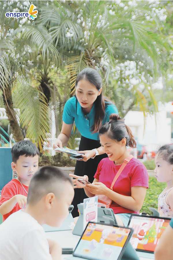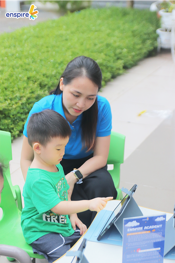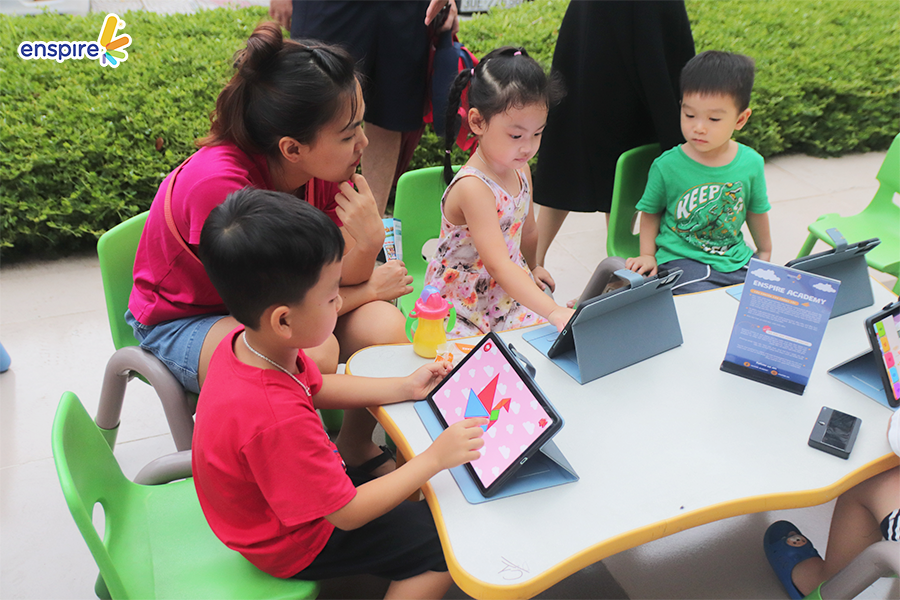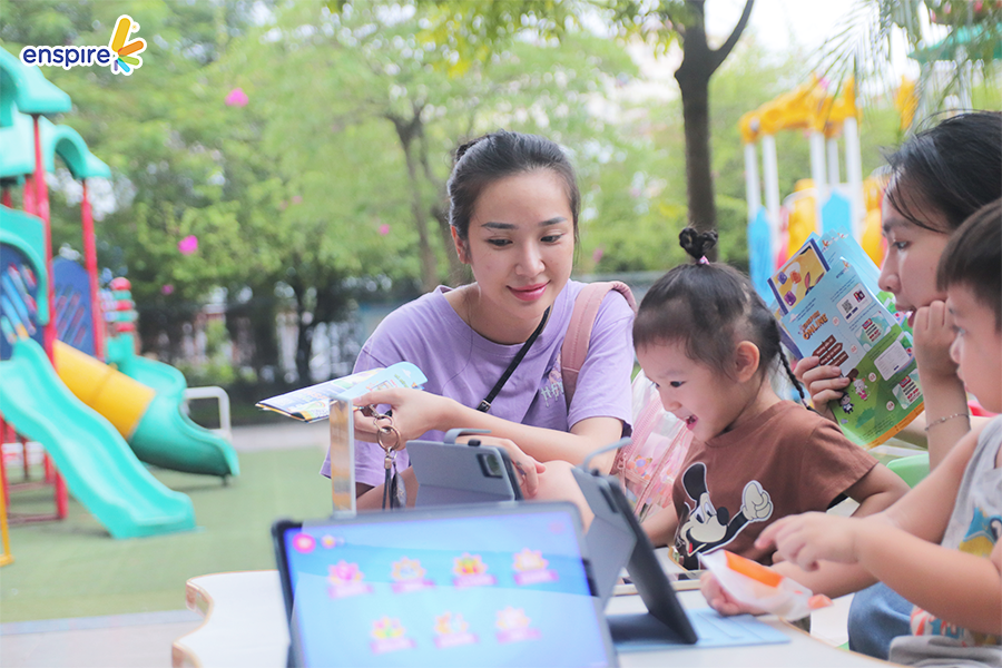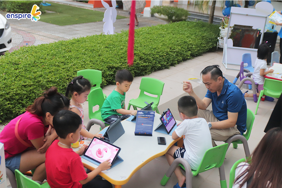 Đặc biệt, Enspire rất vui mừng khi các bạn nhỏ MN ĐT Việt Hưng vô cùng thích thú với hoạt động trải nghiệm ứng dụng Enspire Online. Đây là ứng dụng học tiếng Anh cho trẻ mầm non, được xây dựng với sự kết hợp giữa Trung tâm ngoại ngữ Enspire và Hiệp hội Mầm non Singapore, cùng các chuyên gia hàng đầu thế giới.