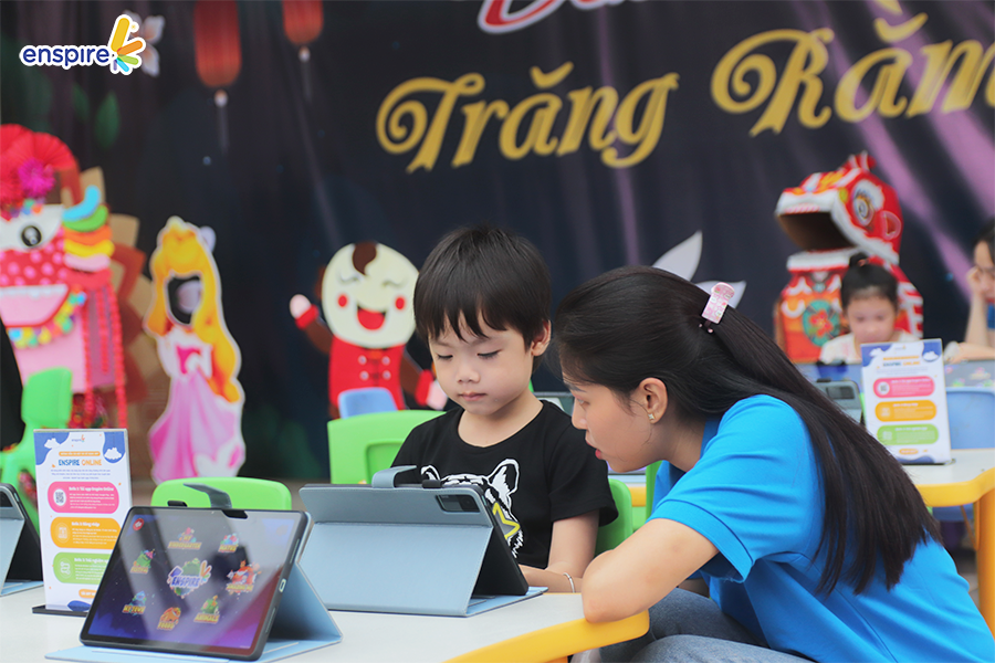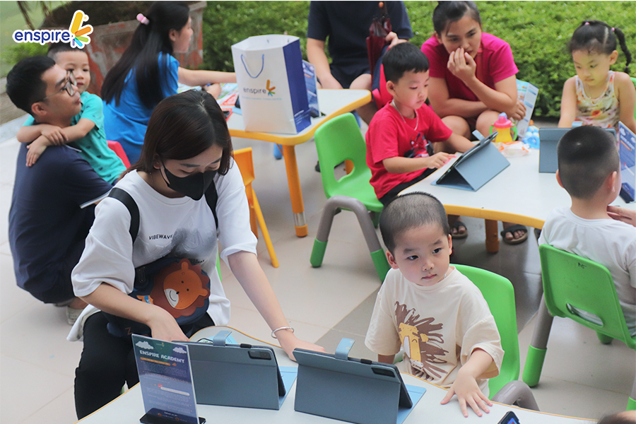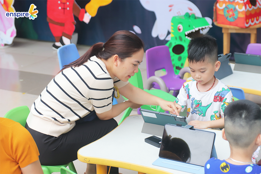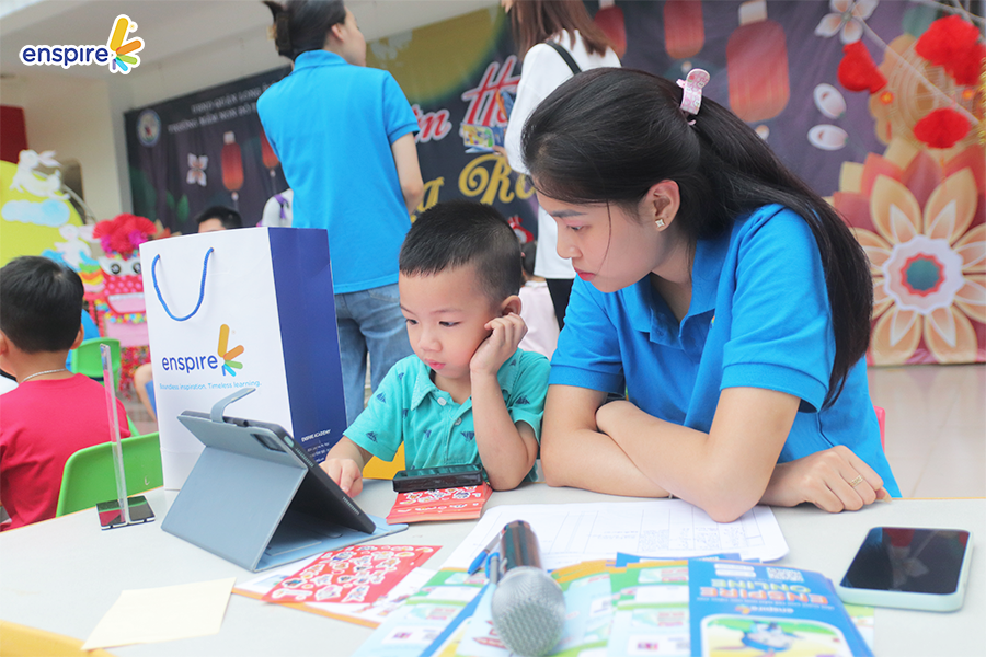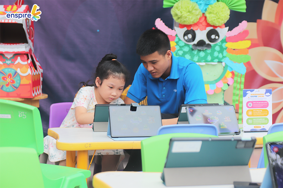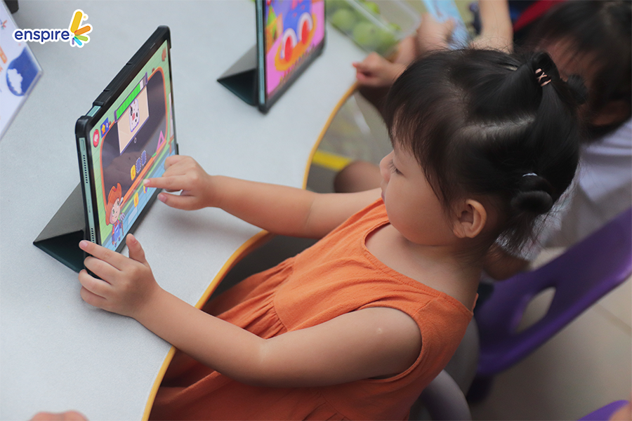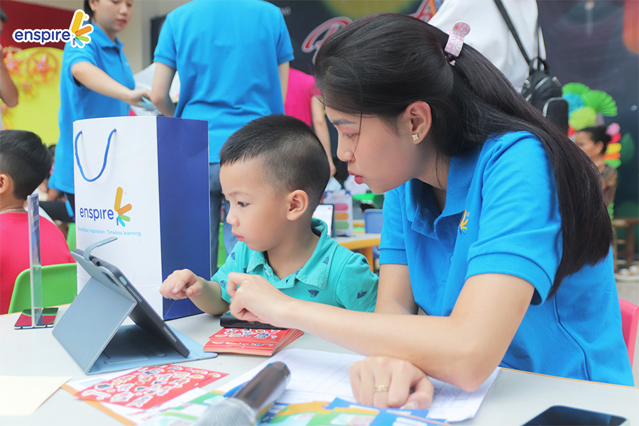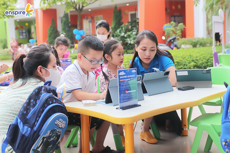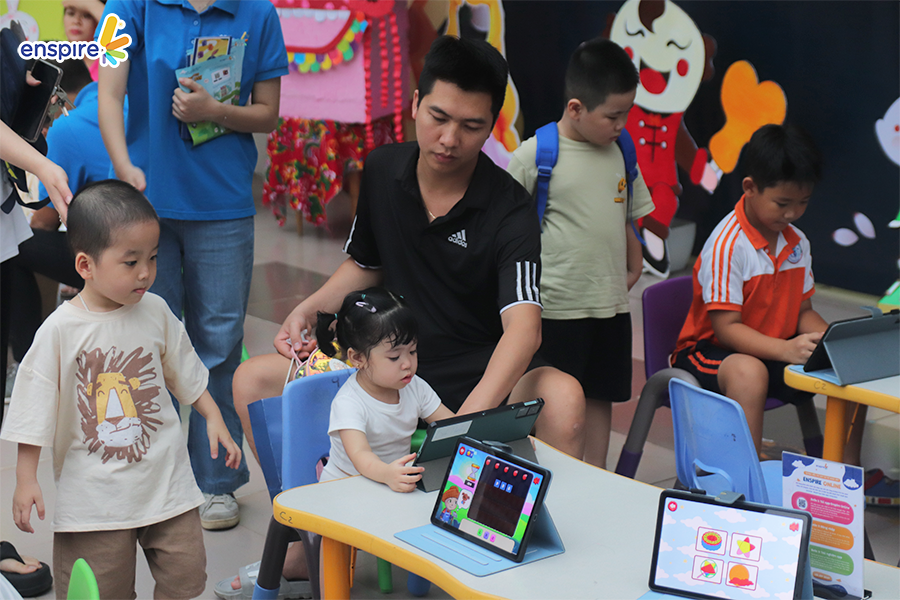 Đặc biệt, Enspire rất vui mừng khi các bạn nhỏ MN ĐT Việt Hưng vô cùng thích thú với hoạt động trải nghiệm ứng dụng Enspire Online. Đây là ứng dụng học tiếng Anh cho trẻ mầm non, được xây dựng với sự kết hợp giữa Trung tâm ngoại ngữ Enspire và Hiệp hội Mầm non Singapore, cùng các chuyên gia hàng đầu thế giới.