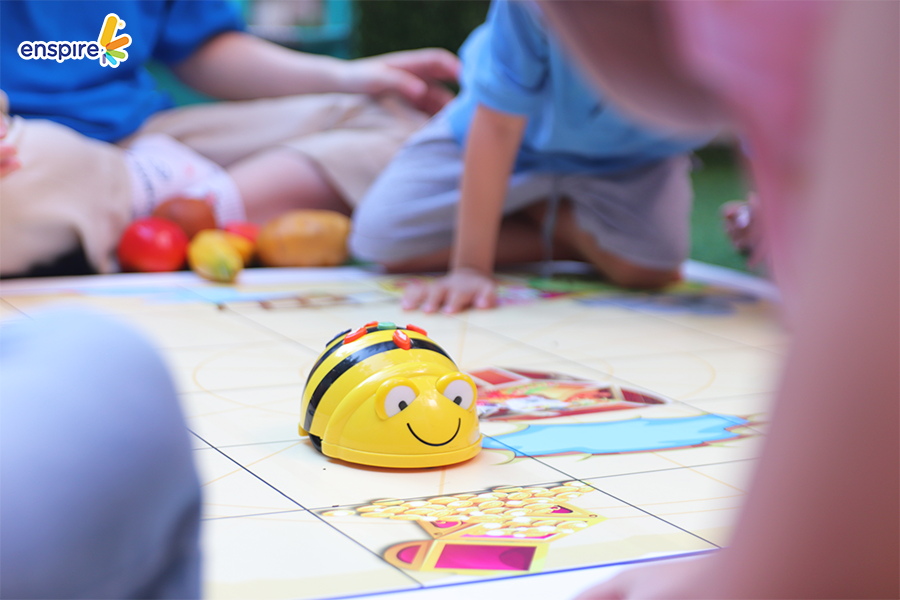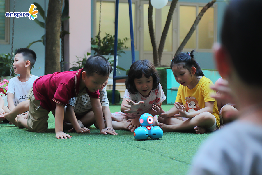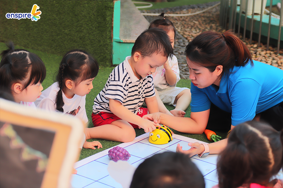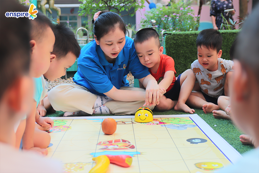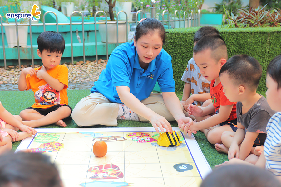 🌷 Robot Kingdom – Vương quốc Robot: Làm quen với ngôn ngữ lập trình thông qua 2 bạn Robot Bee Bot và Robot Dash. Các bạn nhỏ lần lượt được trải nghiệm các hoạt động: Truy tìm kho báu, sa bàn giải cứu thế giới, cùng thầy cô Enspire kể chuyện bằng cách di chuyển robot Beebot trên bản đồ Beebot.