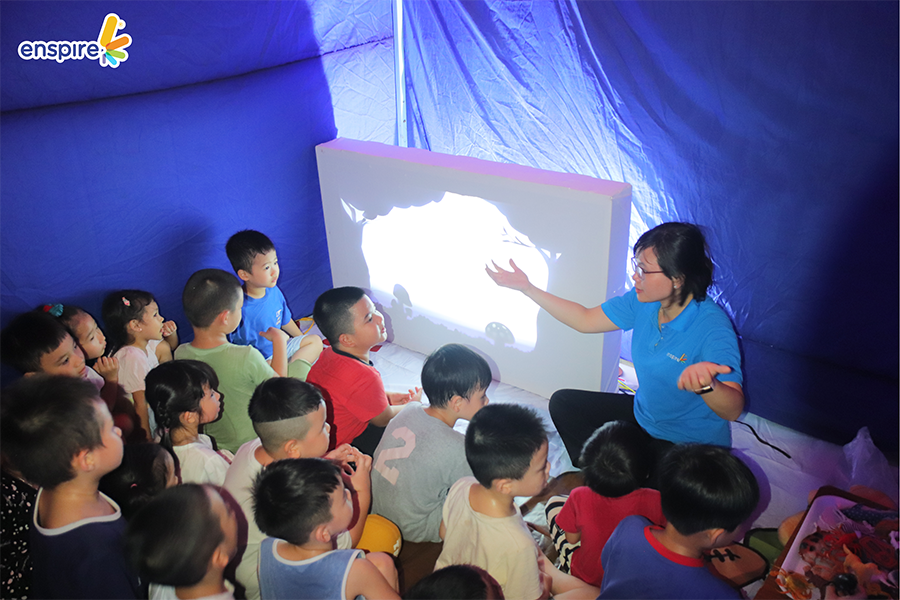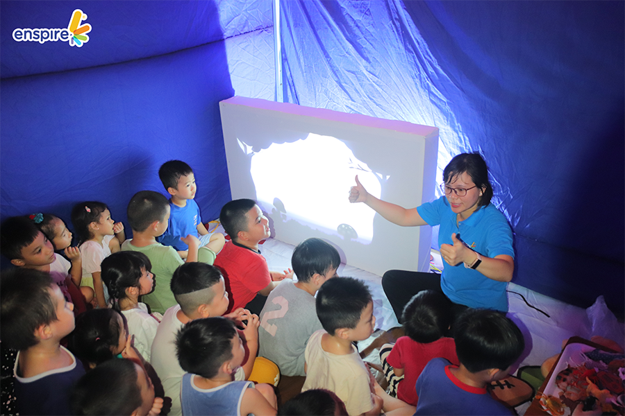 🌷 Galaxy Corner – Phòng ánh sáng: Các bạn nhỏ trải nghiệm rối bóng trong “rạp phim Enspire” trong vòng 5 phút, dưới sự dẫn dắt của Giáo viên Enspire