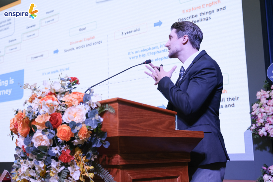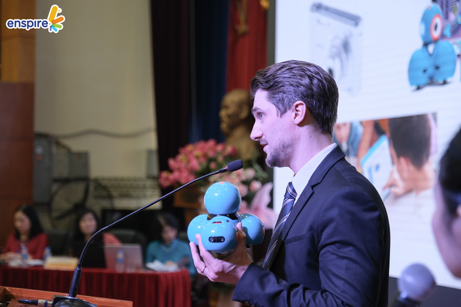 Đại diện Trung tâm Ngoại ngữ Enspire, Chuyên gia giáo dục Axel Berthome đã giới thiệu đến toàn thể hội nghị phương pháp ứng dụng công nghệ để tổ chức cho trẻ làm quen với tiếng Anh trong các trường mầm non.
