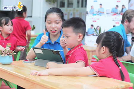 - Góc trải nghiệm ứng dụng Enspire Online: Con được thực hành “học mà chơi, chơi mà học” với ứng dụng Enspire Online. Các bạn nhỏ đều rất hứng thú và vô cùng “chuyên tâm” khi trải nghiệm học tiếng Anh với ứng dụng.
