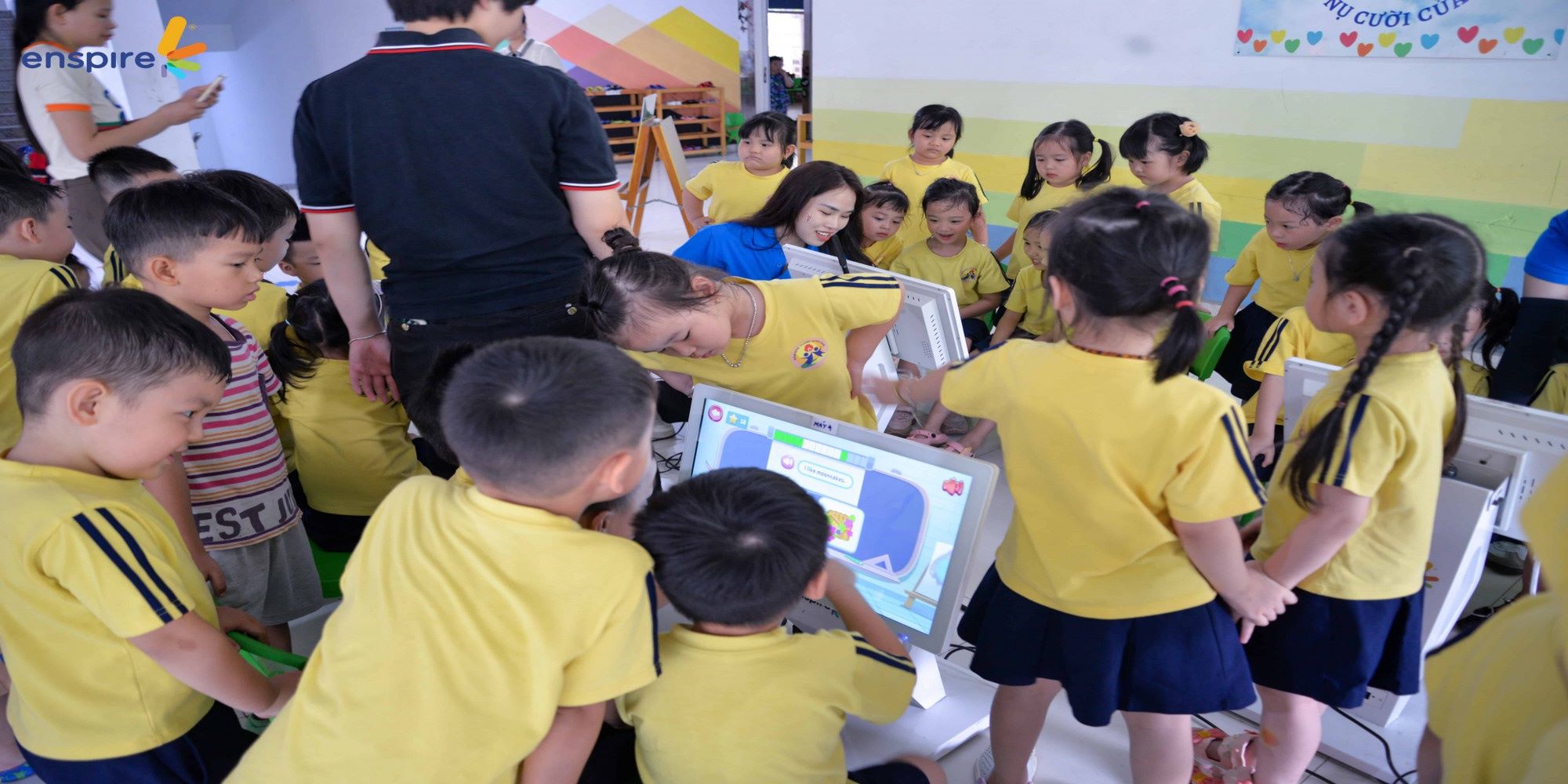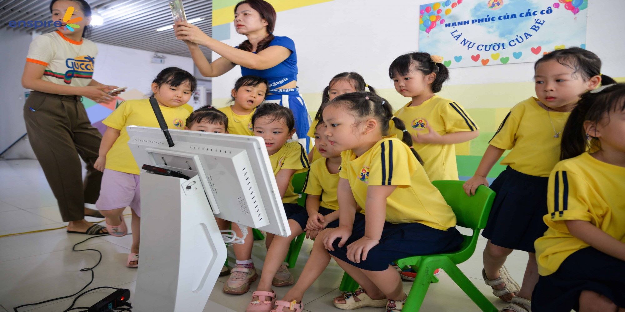 Tại Góc Enspire Online, một góc học tập trải nghiệm đặc biệt trong sự kiện tại Trường mầm non Thanh Xuân Nam lần này. Ở khu vực này, các em học sinh có cơ hội trải nghiệm ứng dụng học tập Enspire online – ứng dụng giúp trẻ mầm non làm quen tiếng Anh độc quyền trên màn tương tác 21 inch. Hoạt động này không chỉ giúp các em làm quen với công nghệ học tập tiên tiến mà còn tạo ra một môi trường học tập sinh động và thú vị.